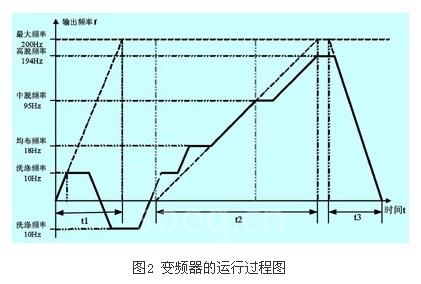 同樣對(duì)于xgq-30f,取重力加速度g=9.8m/s2,可計(jì)算出f2≥193.1hz,于是變頻器的高脫水頻率取194hz,變頻器的運(yùn)行過程如圖2所示。時(shí)間t1表示洗滌時(shí)的加速時(shí)間,因與減速時(shí)間通常一致,因此沒有單獨(dú)標(biāo)出,而t2表示脫水加速時(shí)間,t3表示脫水完畢的減速時(shí)間。為獲得較強(qiáng)揉搓作用,洗滌時(shí)間t1通常設(shè)置得較短,這樣滾筒轉(zhuǎn)速就可以在短時(shí)間內(nèi)達(dá)到設(shè)定值。而脫水的加/減速時(shí)間則設(shè)置得比較長(zhǎng),避免出現(xiàn)過電流或過電壓故障。