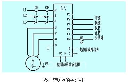 國(guó)內(nèi)的工業(yè)水洗機(jī)多使用lg公司的is5系列洗滌機(jī)械專用變頻器,因此后文涉及到的接線圖或參數(shù)都是按照is5的手冊(cè)給出。其接線圖如圖3所示。