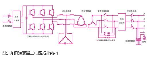 ?。?)逆變器。是將太陽能電池方陣和蓄電池提供的直流電轉(zhuǎn)換成交流電的設備,是光伏并網(wǎng)發(fā)電系統(tǒng)的關鍵部件。由于太陽能電池和蓄電池是直流電源,當負載是交流負載時,逆變器是必不可少的。逆變器按運行方式,可分為獨立運行逆變器和并網(wǎng)逆變器。獨立運行逆變器用于獨立運行的太陽能電池發(fā)電系統(tǒng),為獨立負載供電。并網(wǎng)逆變器用于并網(wǎng)運行的太陽能電池發(fā)電系統(tǒng),本文主要介紹太陽能光伏并網(wǎng)發(fā)電系統(tǒng)[1]。如圖1所示,并網(wǎng)逆變器由igbt等功率開關器件構(gòu)成,控制電路使開關元件有一定規(guī)律的連續(xù)開通或關斷,使輸出電壓極性正負交替,將直流輸入轉(zhuǎn)換為交流輸出。逆變器按輸出波型可分為方波逆變器和正弦波逆變器。方波逆變器電路簡單,造價低,但諧波分量大,一般用于幾百瓦以下和對諧波要求不高的系統(tǒng)。正弦波逆變器成本高,但可以適用于各種負載。