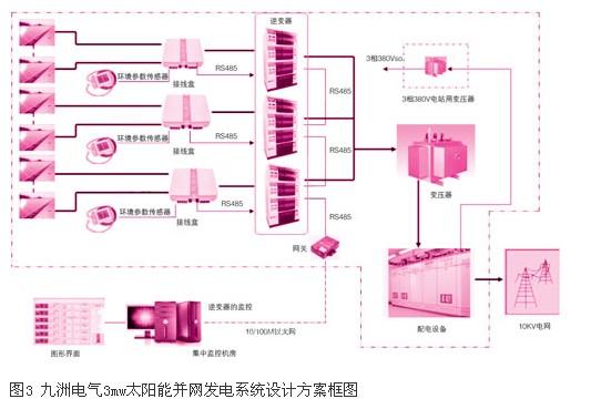 哈爾濱九洲電氣3mw屋頂光伏發(fā)電系統(tǒng),計劃采用分塊發(fā)電、集中并網(wǎng)方案。如圖3,將系統(tǒng)分成3個1mwp的光伏并網(wǎng)發(fā)電單元,并且每個1mw發(fā)電單元采用4臺250kw的并網(wǎng)逆變器的方案。每個光伏并網(wǎng)發(fā)電單元的電池組件采用串并聯(lián)的方式組成太陽能電池陣列,太陽能電池陣列輸入光伏方陣匯流箱后接入直流配電柜,然后經(jīng)光伏并網(wǎng)逆變器和交流防雷配電柜并入變壓配電裝置,最終實現(xiàn)將整個光伏并網(wǎng)系統(tǒng)接入交流電網(wǎng)進行并網(wǎng)發(fā)電方案。
