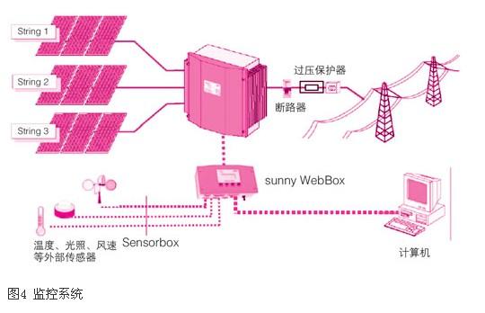 如圖4所示,監(jiān)控系統(tǒng)是以sunny webbox為總控單元,此系統(tǒng)可以連接最多50臺并網(wǎng)逆變器,可以監(jiān)控每臺逆變器的日發(fā)電量,累計發(fā)電量等,同時系統(tǒng)配備環(huán)境傳感器可以采集輻照量、溫度、風速等信息為分析系統(tǒng)發(fā)電量提供依據(jù)。