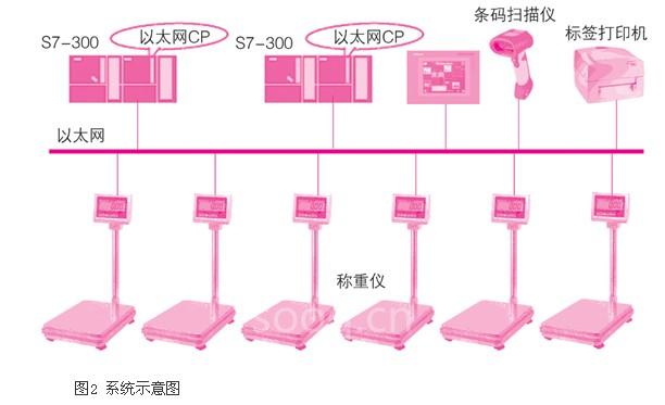 本系統(tǒng)現(xiàn)場(chǎng)設(shè)備主要包含有:godex熱敏標(biāo)簽條碼打印機(jī)、metrologic條形碼掃描儀、tcs電子臺(tái)秤和輥道秤等等,為滿足這些設(shè)備數(shù)據(jù)處理和控制的要求,采用帶有cp343-1通信處理機(jī)的s7-300plc并充分利用工廠現(xiàn)有的局域網(wǎng)資源,組成一個(gè)基于tcp/ip數(shù)據(jù)流的工業(yè)以太網(wǎng)通信方案,以滿足各工藝段的需要,也使s7-300plc資源得到充分的利用和發(fā)揮,系統(tǒng)組成如圖2所示。