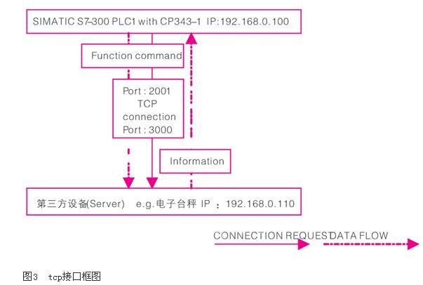 上圖描述了s7-300plc所帶cp模板與現(xiàn)場(chǎng)tcp/ip設(shè)備的連接框架,首先配置s7-300plc作為tcp客戶端,電子臺(tái)秤作為tcp服務(wù)器端,經(jīng)客戶端請(qǐng)求服務(wù)器端來進(jìn)行二者的tcp native連接,連接成功返回后再執(zhí)行send/receive功能服務(wù),來實(shí)現(xiàn)與電子臺(tái)秤的雙向數(shù)據(jù)采集的通信任務(wù)。