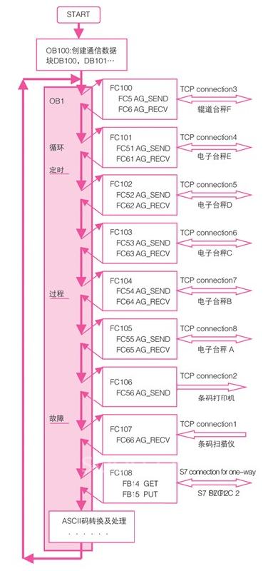 s7-300 plc基于開放通訊的cp343-1模板連接組態(tài)不需要編程,而是通過netpro來組建的,因此其通訊編程只需調(diào)用面向連接的send/receive接口就可完成ascii數(shù)據(jù)收發(fā)工作,系統(tǒng)的s7plc共有八個(gè)tcp連接,其中電子臺(tái)秤共有6套分別占有6個(gè)連接,臺(tái)秤通信過程是雙向應(yīng)答式的,在每一個(gè)連接中完成ascii碼數(shù)據(jù)的讀和寫功能,s7-300整個(gè)通信功能流程如圖4所示。
