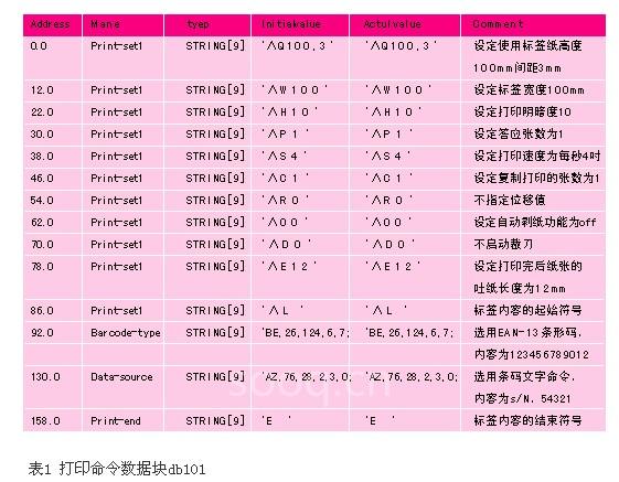 因此對(duì)于標(biāo)簽打印機(jī)按上述格式,將各命令及數(shù)據(jù)進(jìn)行組合就形成組合式命令數(shù)據(jù)流,當(dāng)然必需滿足ezpl程序語言所規(guī)定的語法,其內(nèi)容主要包含標(biāo)簽高度、寬度、間距、 明暗度、速度、剝紙功能、邊界起點(diǎn)、條碼類型和條碼數(shù)據(jù)等等,下面的程序范例是打印一張ean 13的條形碼標(biāo)簽,ezpl程序本身是一般的字符文件或命令行,無論使用何種語言編寫程序,只需送出該字符文件的內(nèi)容即可控制條形碼機(jī)來打印,ezpl程序命令行數(shù)據(jù)必須以ascii碼值存放于打印命令數(shù)據(jù)塊db101中供fc56 ag_send接口使用,db101命令數(shù)據(jù)塊如表1所示。