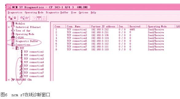 與simatic manager管理器相同,在左側(cè)的瀏覽區(qū)中,可看到分層排列的診斷對(duì)象,顯示的對(duì)象結(jié)構(gòu)與當(dāng)前正在檢查的cp類型、該cp組態(tài)的功能和相匹配的連接,瀏覽區(qū)中顯示了本地plc當(dāng)前共有8個(gè)在線tcp connection連接;在右側(cè)的內(nèi)容區(qū),將可發(fā)現(xiàn)在瀏覽區(qū)域中選定的診斷功能的結(jié)果和狀態(tài),即反映出這8個(gè)tcp connection連接的通信收發(fā)狀況,分別對(duì)應(yīng)了6套臺(tái)秤(tcp connection3~connection8)、1套標(biāo)簽打印機(jī)(tcp connection2)和1套條碼掃描儀(tcp connection1),還包含連接狀態(tài)、接收狀態(tài)和發(fā)送狀態(tài)等信息。如發(fā)生連接錯(cuò)誤、中斷或警告,將在ncm s7左側(cè)的瀏覽區(qū)中顯示,如圖6所示: