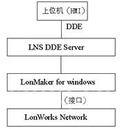 此種監(jiān)控系統(tǒng)的基本結(jié)構(gòu)如圖1所示。其基本組件為:上位機(jī)(裝有監(jiān)控組態(tài)軟件)、LNS DDE Server、LonMaker for windows、LonWorks網(wǎng)絡(luò)等。在此系統(tǒng)中,上位機(jī)可監(jiān)視LonWorks網(wǎng)絡(luò),讀取網(wǎng)絡(luò)中節(jié)點(diǎn)采集的實(shí)時(shí)數(shù)據(jù),顯示各節(jié)點(diǎn)的工作狀況及歷史圖表,實(shí)現(xiàn)對(duì)數(shù)據(jù)的判別、分析及貯存等。同樣,上位機(jī)也可控制LonWorks網(wǎng)絡(luò),能直接向被控設(shè)備發(fā)送命令,控制某一節(jié)點(diǎn)的狀態(tài)。