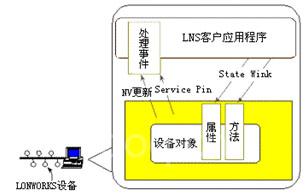 如圖2所示為一個(gè)LNS編程模型的例子。 “設(shè)備對(duì)象”表示一個(gè)應(yīng)用設(shè)備的一個(gè)對(duì)象,它提供了一套方法與屬性。LNS客戶應(yīng)用程序通過(guò)LNS ActiveX 控件賦予對(duì)象屬性和方法,使對(duì)象發(fā)生改變。比如把“State”(狀態(tài))賦予對(duì)象的屬性,把“Wink”(閃爍)賦予對(duì)象的方法,使該設(shè)備產(chǎn)生相應(yīng)的變化。而當(dāng)設(shè)備發(fā)生網(wǎng)絡(luò)變量更新或Service Pin時(shí),通過(guò)LNS ActiveX 控件以事件報(bào)告設(shè)備對(duì)象所發(fā)生的變化,應(yīng)用程序根據(jù)這些事件進(jìn)行相應(yīng)的處理。