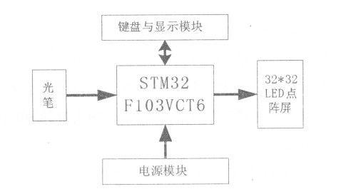 本系統(tǒng)總體框圖如圖1 所示,由鍵盤與顯示模塊、光筆模塊、LED 點(diǎn)陣屏模塊、STM32 控制模塊、電源模塊五部分組成。