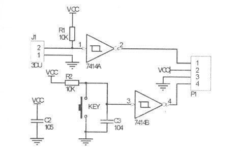 人眼能分辨刷屏次數(shù)為24 次,根據(jù)經(jīng)驗(yàn)本系統(tǒng)點(diǎn)陣屏的刷屏速度采用每秒70 次的經(jīng)驗(yàn)刷屏次數(shù),即70Hz,故要求光筆的反應(yīng)速度大于70Hz.掃描方式是每一時(shí)刻只有一個(gè)點(diǎn)點(diǎn)亮,并且這個(gè)亮點(diǎn)朝一個(gè)方向移動(dòng),這時(shí)主控掃描的速度是1M.使用的點(diǎn)陣屏為32 ×32.當(dāng)每秒刷屏次數(shù)超過(guò)24 次時(shí)才看不出點(diǎn)陣屏閃爍,在本系統(tǒng)中每秒刷屏68 次,所以光電器件所要達(dá)到的頻率最小為68Hz,光電三極管( 3DU33) 靈敏度高,響應(yīng)時(shí)間短,光敏三極管輸出的脈沖經(jīng)過(guò)74HC14 整形輸出。光筆電路圖如圖2 所示: