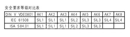 德國(guó)DIN V 19250及DIN V VDE0804對(duì)安全要求等級(jí)(Safety Requirement Classes)分為8級(jí),安全要求從低到高為AK1~AK8,對(duì)應(yīng)各標(biāo)準(zhǔn)的安全等級(jí)對(duì)比如表所示。