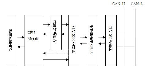 CAN總線系統(tǒng)智能監(jiān)控節(jié)點由5部分組成:微控制器Mega8,并串轉(zhuǎn)換電路,獨立CAN控制器SJA1000,CAN總線驅(qū)動器TJA1050和高速光電耦合6N137。如圖2所示