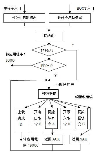 BOOT引導程序在設計時提供了兩個入口,一個是系統(tǒng)復位時的冷啟動入口,另一個是用戶程序在運行時進入升級程序的熱啟動入口。BOOT程序主要包括燒錄子程序、串口發(fā)送、串口接收、引導主程序等。