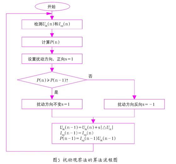 擾動(dòng)觀察法的工作原理就是借以周期性的改變負(fù)載大小來(lái)改變光伏電池的輸出電壓及功率,也就是改變光伏陣列的工作點(diǎn),它通過(guò)觀察比較和變動(dòng)前后兩次的輸出功率和輸出電壓的大小來(lái)決定下個(gè)周期負(fù)載的變動(dòng)是增加還是減少。該方法的具體操作是給輸出電壓一個(gè)擾動(dòng)值,其方向可正(s=1),可負(fù)(s=-1),然后根據(jù)測(cè)出的電壓電流值計(jì)算出太陽(yáng)電池的輸出功率p(n),然后將其與上一個(gè)測(cè)量值p(n-1)進(jìn)行比較。若輸出功率增大,說(shuō)明擾動(dòng)所加的方向有利于輸出功率的提高,此后繼續(xù)向這個(gè)方向施加擾動(dòng)并繼續(xù)觀察,若施加的擾動(dòng)使光伏陣列的輸出功率減小,說(shuō)明擾動(dòng)的方向錯(cuò)誤,則在下一次的擾動(dòng)中使方向相反,如此不停的觀察調(diào)整,以使光伏電池工作在最大功率點(diǎn)附近。擾動(dòng)觀察法的算法流程圖如圖5所示。