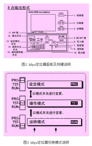 由于電池生產(chǎn)工藝的特殊需求,電池在裝配盤上不同位置需要進行相對應(yīng)的加工動作;即不同的工位需要設(shè)備上的plc產(chǎn)生不同的輸入輸出,要求設(shè)備能夠較準(zhǔn)確的定位。一般情況下一臺設(shè)備要求有5-6個工位的輸出,角度精度要求5°以下,所以在改造過程選型中選用了歐姆龍公司的h8ps8位輸出型及分辨率256的旋轉(zhuǎn)編碼器就完全可以滿足設(shè)備需求。由于該生產(chǎn)線設(shè)備使用的是很老eberla pls511s型plc,更換plc的話,布線編程都比較麻煩,而且成本較高;所以筆者直接選用配套的歐姆龍凸輪定位器,總的改造成本在6000-7000元之間,并最終達到很好的效果,提高了生產(chǎn)效率。