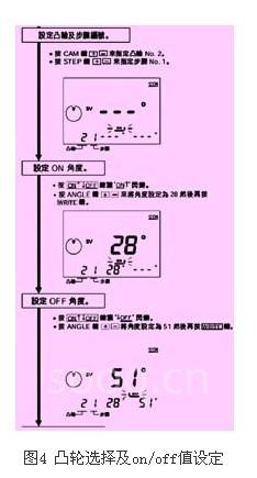 切換到設(shè)定模式(prg),將設(shè)定模式開關(guān)打到man(手動),按動cam(凸輪)下面的+或-鍵來選擇需要設(shè)定的凸輪,on/off鍵切換on點設(shè)定和off點設(shè)定,angle(角度)下面的+或-鍵用來增加和減少角度值,設(shè)定好的角度值通過write(寫入)鍵寫入到內(nèi)存中。如圖4所示。