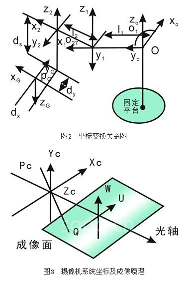 本文擬對系統(tǒng)進行實驗研究。建立機器人坐標、攝像機坐標、圖像坐標和目標點坐標的坐標變換關系。圖2是在機器人的第二根桿末端安裝一個攝像頭,形成eye-in-hand構型而建立的坐標變換關系圖。圖3是攝像機系統(tǒng)坐標與圖像坐標的關系及成像原理示意圖。