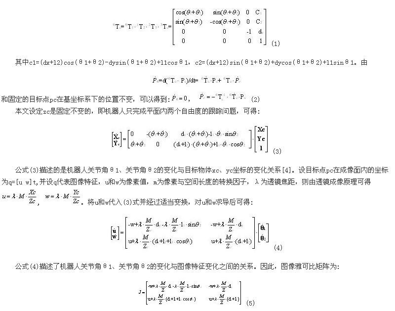 設機器人第一關節(jié)和第二關節(jié)的轉角分別為θ1和θ2,第一根桿長為l1,第二根桿長為l2。選取圖2中o點作為基坐標參考點,用[x0 y0 z0]t表示,攝像機坐標系用[xc yc zc]t表示,圖像坐標系用[u w]t表示;機器人第一關節(jié)用[x1 y1 z1]t表示,第二關節(jié)用[x2 y2 z2]t表示,設固定的目標點pc在攝像機坐標系(c)的齊次坐標為: pc =[xc yc zc1]t,在基坐標系(o)的齊次坐標為:p0=[x0 y0 z0 1]t,兩個坐標系之間的變換關系為:p0=0tcpc。