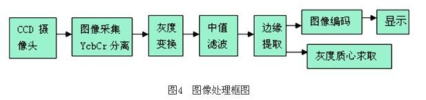 由ccd攝像頭攝取的按4:2:2格式傳輸?shù)牟噬M視頻信號經(jīng)過解碼芯片的采集,對y、cb、cr信號按照2:1:1采樣率進行采樣,并將它們分離開來。在dsp系統(tǒng)中將彩色圖像轉變成灰度圖像,對該圖像進行閾值二值化后變成二值圖像,然后經(jīng)過中值濾波濾除噪聲點,使用sobel算子進行邊界提取。對該邊界圖像信號使用點hough質心求取算法求取質心圖像坐標[3],并通過串口通訊將質心坐標值傳遞給工控機程序;同時,處理后的數(shù)字視頻信號經(jīng)過編碼芯片編碼后,送顯示設備實時顯示。
