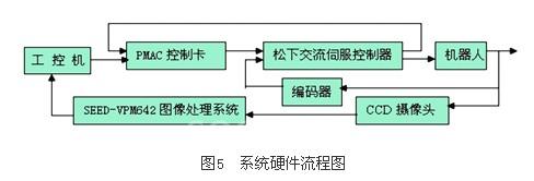 本實驗系統(tǒng)由工控機、pmac運動控制卡、松下交流伺服系統(tǒng)、dsp圖像處理系統(tǒng)和機器人組成。了解和熟悉松下交流伺服系統(tǒng)的原理和功能后,調試機器人關節(jié)伺服電機的運行,優(yōu)化相關控制參數(shù)以求獲得最好伺服效果;研究pmac運動控制卡的原理和功能,并與松下交流伺服系統(tǒng)配合,編寫運動程序,不斷調整和優(yōu)化pmac卡的控制參數(shù),以求獲得滿意的運動控制效果;對seed-vpm642圖像處理系統(tǒng)進行深入學習和研究后,開發(fā)視頻圖像處理程序。組成該系統(tǒng)的硬件流程圖如圖5所示。