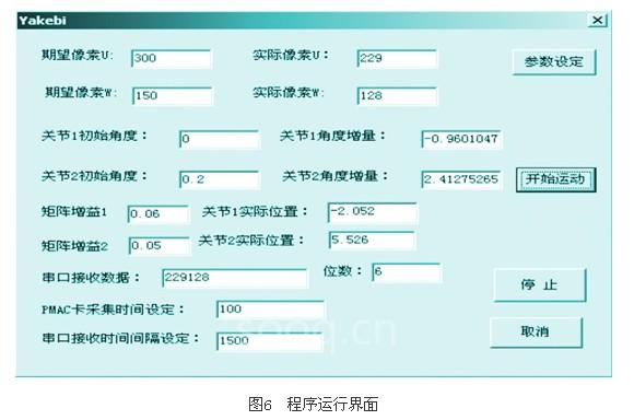 基于上述系統(tǒng)原理,在vc++6.0環(huán)境下編寫主控程序,主控程序主要包括界面的顯示和人機交互部分、圖像雅可比矩陣逆陣部分、pmac應用程序部分,串口通信部分、數(shù)據(jù)存儲部分。程序運行界面如圖6所示。