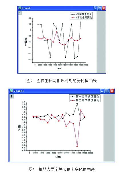 根據(jù)以上數(shù)據(jù)運用originpro軟件繪制的圖形如下:圖7是圖像坐標兩相鄰時刻的變化值曲線,圖8是機器人兩個關節(jié)角度變化值曲線。