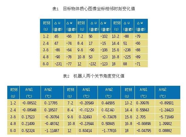 本實驗利用兩個時刻的像素誤差作為控制量,來驗證視覺伺服算法是否正確和上述系統(tǒng)是否實際可行。通過設置關節(jié)1、關節(jié)2的初始角度分別為0和0.2弧度,期望像素值u和w分別為200和110,實際像素u和w初始值分別為95和150,矩陣增益1和2分別為0.06和0.05,pmac卡采集時間設定為100ms,伺服周期設定為1.2s。下面兩表是根據(jù)以上設置進行實驗的一組數(shù)據(jù)。表1是物體質心圖像坐標兩相鄰時刻的變化值,表2是由程序計算出的機器人兩個關節(jié)角度變化值。