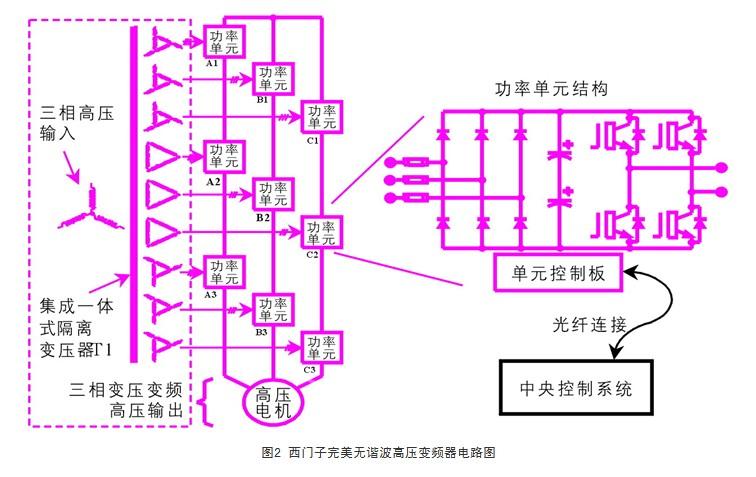 本次設(shè)備改造選用了西門(mén)子羅賓康完美無(wú)諧波變頻器,型號(hào)為ph-6-6-1250,變頻器的電路圖如圖2所示。輸入隔離變壓器t1的每一個(gè)次級(jí)僅供給一個(gè)功率單元,每個(gè)功率單元通過(guò)光纖接收調(diào)制信息以產(chǎn)生負(fù)載所需要的輸出電源頻率,每個(gè)功率單元可分為整流部分、直流環(huán)節(jié)和逆變部分。
