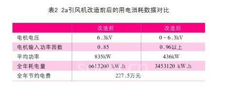 將2a引風(fēng)機(jī)改造前后的用電消耗數(shù)據(jù)對(duì)比,列表如表2所示。