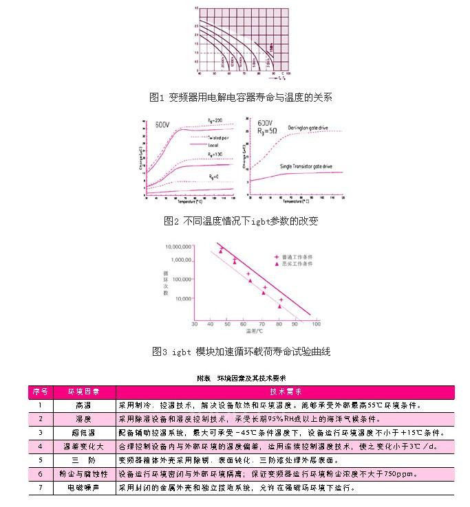?。?)隨著高壓變頻器在水泥、鋼鐵、冶金、礦山、石化、電力等行業(yè)的推廣應(yīng)用,高溫、高粉塵、高濕、高腐蝕、晝夜溫差大等惡劣環(huán)境條件,對(duì)變頻器安全無故障運(yùn)行的影響程度越發(fā)突出,導(dǎo)致設(shè)備停機(jī)、影響生產(chǎn)、造成巨大經(jīng)濟(jì)損失的情況日益嚴(yán)重。并且,解決好高壓變頻器運(yùn)行環(huán)境問題,在野外作業(yè)和特殊工況條件中,運(yùn)行環(huán)境成為必須解決的重要問題之一。據(jù)一份美國(guó)軍方公布的電氣環(huán)境對(duì)電子設(shè)備安全的評(píng)估報(bào)告中顯示:在設(shè)備故障原因的調(diào)查分析中,80%是由于設(shè)備運(yùn)行環(huán)境因素所致,其中溫度原因占55%、濕度25%、粉塵影響12%、振動(dòng)和電磁噪聲13%;由于電路設(shè)計(jì)和元器件質(zhì)量問題引發(fā)設(shè)備故障的只有20%。由此可見,環(huán)境對(duì)電氣設(shè)備安全的影響程度可窺一斑。圖1~圖3所示為環(huán)境對(duì)變頻器的主要元器件影響。