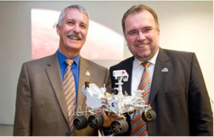 NASA火星探測(cè)計(jì)劃項(xiàng)目主管Doug McCuistion與西門子工業(yè)業(yè)務(wù)領(lǐng)域CEO魯思沃博士共同展示火星探測(cè)器模型