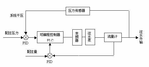 系統(tǒng)閉環(huán)控制過程如下:由智能傳感器對各運(yùn)行注水泵進(jìn)行實(shí)時(shí)數(shù)據(jù)監(jiān)控和處理,即采集和傳輸注水泵、站的運(yùn)行參數(shù),如:泵的排量Q單、電機(jī)電流I、泵進(jìn)、出口壓力P泵,注水站出口干壓P干、總排量Q總、平均單耗等,并將這些控制參數(shù)(Q單、I、P泵,P干、Q總、)與其期望值及泵本身的特性曲線進(jìn)行對比和優(yōu)化計(jì)算。其中,注水站干壓和總流量是系統(tǒng)所需監(jiān)測和控制的兩個(gè)最主要參數(shù)。本系統(tǒng)中,一方面在泵出口管線上安裝一只高可靠性壓力傳感器,將實(shí)測的壓力信號(hào)與系統(tǒng)的配注壓力(期望值)相比,并將其差值送往過程參數(shù)調(diào)節(jié)器(PID)進(jìn)行比例和積分運(yùn)算,最后將輸出結(jié)果送給可編程控制器(PLC);另一方面在泵入口管線上安裝一只流量計(jì),用于監(jiān)測系統(tǒng)實(shí)際總流量,將該值與系統(tǒng)配注量的差值再進(jìn)行一次PID整定,最后將輸出結(jié)果送給PLC。PLC根據(jù)所接收的兩個(gè)PID整定信號(hào),利用模糊推理的方法,在滿足系統(tǒng)干壓的前提下,系統(tǒng)及時(shí)自動(dòng)調(diào)整高壓變頻器的輸出頻率從而控制變頻泵的轉(zhuǎn)速。由離心泵原理知,泵轉(zhuǎn)速的變化可引起相應(yīng)的排量變化,通過頻率的變化以達(dá)到期望的排量值。通過上述閉環(huán)控制,使系統(tǒng)的實(shí)際壓力和排量與系統(tǒng)的配注壓力和配注量相接近。系統(tǒng)設(shè)計(jì)為閉環(huán)控制系統(tǒng),流量和壓力為系統(tǒng)的兩個(gè)主要參數(shù),將系統(tǒng)實(shí)測的流量和壓力信號(hào)與地質(zhì)要求的流量和壓力(期望值)進(jìn)行雙PID調(diào)節(jié);通過模糊推理的方法自動(dòng)尋優(yōu)控制,根據(jù)推理結(jié)果,系統(tǒng)及時(shí)自動(dòng)調(diào)整高壓變頻器的輸出,并自動(dòng)計(jì)算出變頻器的最佳運(yùn)行頻率。