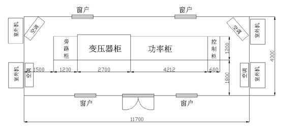 凝結(jié)泵高壓變頻器室內(nèi)尺寸為:長11700mm,寬4000mm,高3500mm。尺寸平面布置如圖1所示。