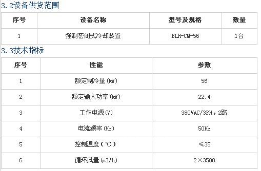 強(qiáng)制密閉式冷卻裝置按照單臺高壓變頻裝置的功率柜為對象進(jìn)行對等配置。2240kW的變頻器配置的閉式冷卻裝置功率值=2240×2%×1.25(設(shè)計(jì)裕度)=56kW,實(shí)際選用56kW的閉式冷卻裝置。根據(jù)閉式冷卻裝置的設(shè)計(jì)原則,該套冷卻系統(tǒng)僅限于對溫度要求較高的功率柜進(jìn)行配置。變壓器柜采用開放式冷卻,溫度散失到環(huán)境中;允許溫升80K,高溫報(bào)警值120℃完全能夠滿足運(yùn)行安全的要求。
