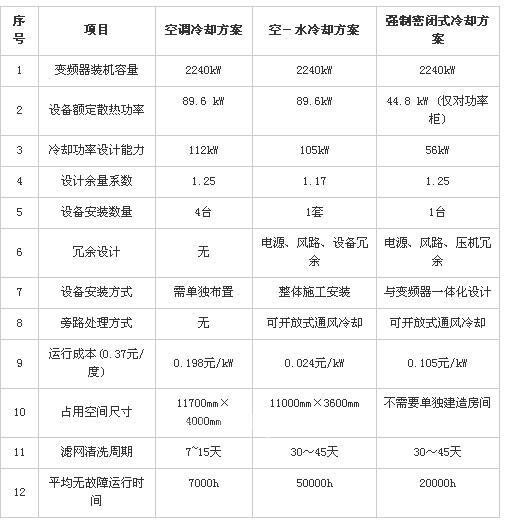 高壓變?yōu)l器應(yīng)用中的設(shè)備散熱和運(yùn)行環(huán)境問題直接影響設(shè)備自身的安全,隨著變頻器功率的不斷提高,其輔助冷卻的投資和運(yùn)營成本也逐漸得到業(yè)內(nèi)和客戶的關(guān)注。采用專業(yè)的高壓變頻專用冷卻系統(tǒng),提高設(shè)備安全穩(wěn)定性能,降低輔助冷卻系統(tǒng)的運(yùn)營成本,成為高壓變頻應(yīng)用中需要考慮的重要問題之一。下面就以2240kW凝結(jié)泵高壓變頻器的冷卻解決方案為例,對幾種冷卻方式進(jìn)行可行性分析論證。