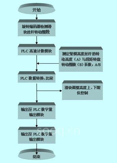 為解決上述問(wèn)題,汽車(chē)行業(yè)普遍采用編碼器解決方案。此方案利用旋轉(zhuǎn)編碼器記錄滑塊高度,將信號(hào)送給歐姆龍plc高速計(jì)數(shù)模塊,經(jīng)過(guò)歐姆龍plc處理轉(zhuǎn)化為十進(jìn)制數(shù)值,然后顯示滑塊高度。編碼器方案的程序框圖如圖1所示。