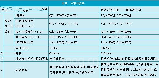 但是對(duì)比接近開(kāi)關(guān)方案,編碼器方案的成本投入大,同時(shí)要求plc能支持高速計(jì)數(shù)模塊,對(duì)現(xiàn)場(chǎng)的環(huán)境要求高。兩種方案的比較參見(jiàn)附表所示。