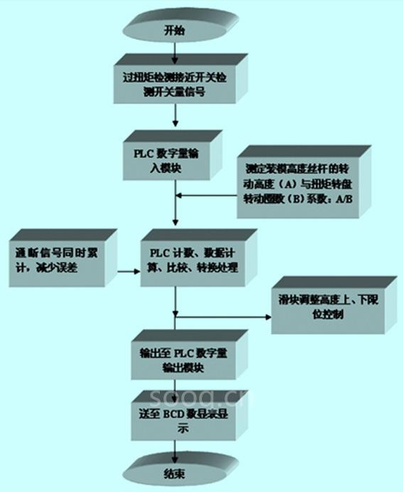 目前,我們采用的是接近開(kāi)關(guān)方案。此方案通過(guò)接近開(kāi)關(guān)檢測(cè)壓力機(jī)機(jī)械傳動(dòng)軸旋轉(zhuǎn)的圈數(shù),將信號(hào)送到歐姆龍plc,經(jīng)過(guò)內(nèi)部程序處理,輸出到歐姆龍plc數(shù)字量輸出模塊,在bcd碼顯示器上顯示滑塊高度。接近開(kāi)關(guān)方案的程序框圖如圖2所示。