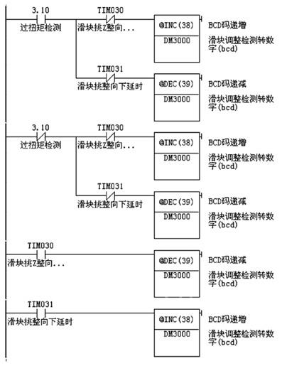 (1)利用壓力機(jī)設(shè)備上現(xiàn)有的接近開(kāi)關(guān),檢測(cè)滑塊調(diào)整機(jī)構(gòu)絲桿旋轉(zhuǎn)的圈數(shù),將檢測(cè)到的圈數(shù)送入歐姆龍plc。我們運(yùn)用歐姆龍plc的特殊指令inc和dec,通過(guò)bcd遞增和遞減功能來(lái)實(shí)現(xiàn)傳動(dòng)軸正轉(zhuǎn)和反轉(zhuǎn)時(shí),檢測(cè)圈數(shù)的加減。程序如下: