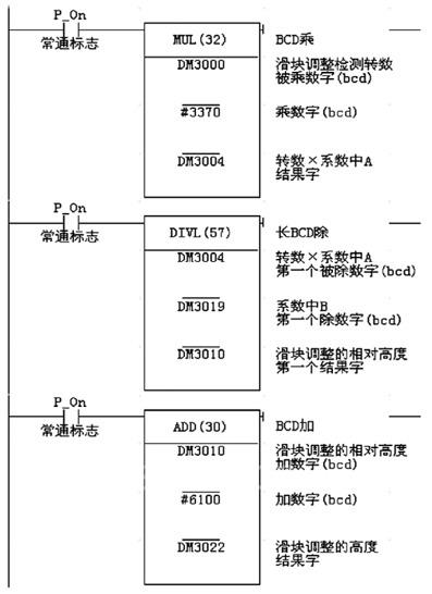 (3)經(jīng)過(guò)程序的運(yùn)算,將傳動(dòng)圈數(shù)乘以傳動(dòng)系數(shù),就可以得出滑塊調(diào)整高度的當(dāng)前值,再通過(guò)歐姆龍plc將數(shù)值以bcd碼的形式,在歐姆龍plc的輸出模塊(oc222),以繼電器形式輸出。程序如下:
