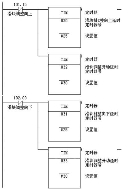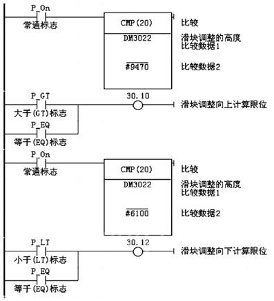 (5) 同時(shí)需要在程序里設(shè)置上下軟限位來(lái)控制滑塊調(diào)整的行程,防止硬件限位不起作用而發(fā)生超行程現(xiàn)象。程序如下: