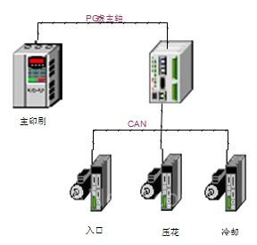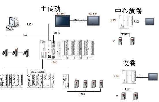 根據(jù)要求選擇了臺(tái)達(dá)全系產(chǎn)品的集成應(yīng)用,同步性要求高的選擇臺(tái)達(dá)A2的伺服,張力控制要求的用帶收放卷功能的臺(tái)達(dá)VE變頻器,主控采用10MC運(yùn)動(dòng)控制器,并采用多屏一機(jī)的以太網(wǎng)屏,收放卷采用獨(dú)立PLC 控制方式,主控與遠(yuǎn)程站通訊方式采用DEVICENET網(wǎng)絡(luò),下層的變頻器通訊采用RS485的MODBUS通訊。