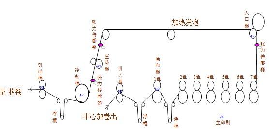 從流程圖可見(jiàn)工藝流程:放卷出的原料紙經(jīng)過(guò)1色全色印染然后6道選色印染,然后經(jīng)過(guò)加熱發(fā)泡膨脹,再經(jīng)過(guò)壓輥壓花,冷卻就變成合格成品進(jìn)入收卷棍。整個(gè)過(guò)程紙料需保持恒張力和同步。