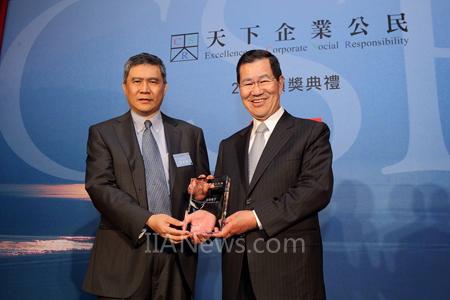 臺達電子海英俊董事長(左)出席2012天下雜志企業(yè) 公民獎頒獎典禮, 自蕭萬長前副總統(tǒng)手中接過大型企業(yè)首獎