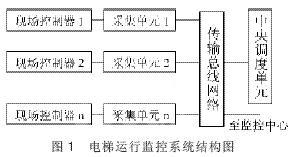 電梯運(yùn)行監(jiān)控系統(tǒng)的構(gòu)成如圖1 所示,主要包括中央調(diào)度單元、采集單元、傳輸總線和現(xiàn)場(chǎng)控制器。其特征在于:①中央調(diào)度單元負(fù)責(zé)實(shí)現(xiàn)電梯的群控功能(通過(guò)對(duì)經(jīng)驗(yàn)知識(shí)進(jìn)行學(xué)習(xí)、使用和獲取的方法,即系統(tǒng)的自學(xué)習(xí),再根據(jù)各個(gè)電梯的現(xiàn)行狀態(tài)信息,采用一定的調(diào)配策略,用算法分析出哪臺(tái)電梯響應(yīng)呼叫會(huì)使電梯系統(tǒng)得到最優(yōu)的性能, 再將此信號(hào)分配給相應(yīng)的控制器);②數(shù)據(jù)采集單元主要負(fù)責(zé)電梯的狀態(tài)信息的收集;③總線用于中央調(diào)度單元和采集單元以及遠(yuǎn)程監(jiān)控的數(shù)據(jù)傳輸。