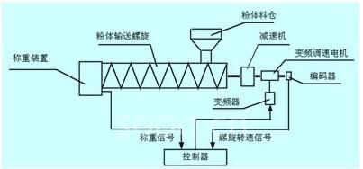 氯化鉀粉體進(jìn)入料倉(cāng)后,在振動(dòng)器的作用下進(jìn)入螺旋輸送機(jī),氯化鉀粉體沿螺旋槽向出料口方向前進(jìn)。在出料口下方的稱量裝置傳感器將檢測(cè)到的重量信號(hào)傳送到plc的模擬量輸入單元。同時(shí),安裝在電機(jī)非負(fù)載軸端的編碼器檢測(cè)螺旋軸旋轉(zhuǎn)的周數(shù)和速度,編碼器輸出脈沖傳送到plc的高速計(jì)數(shù)單元。經(jīng)cpu單元運(yùn)算處理后,得到氯化鉀粉體的流量值和累積重量值,由模擬量輸出單元輸出控制信號(hào),控制變頻器和變頻電機(jī),從而控制氯化鉀粉體的流量。氯化鉀流量是流量比值控制系統(tǒng)的主動(dòng)量。粉體流量(給料量)表達(dá)式為: