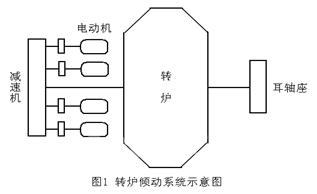 在大中型轉(zhuǎn)爐系統(tǒng)中,爐體傾動部分一般采用四臺傾動電機,通過減速機剛性連接,并采用全懸掛固定方式和扭力矩吸收方式。煉鋼廠轉(zhuǎn)爐傾動裝置在實際生產(chǎn)操作過程中,需對轉(zhuǎn)爐傾動裝置進行頻繁的起動、制動及加減速操作,所以對傾動裝置的控制精度及系統(tǒng)的響應(yīng)時間有很高的要求。