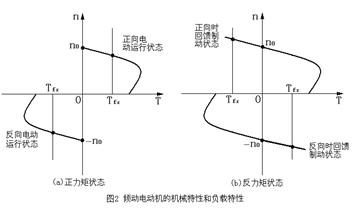 根據(jù)轉(zhuǎn)爐控制工藝要求,轉(zhuǎn)爐的傾動角度為正反360°,當轉(zhuǎn)爐爐口與爐底方向軸線與地平面垂直時為垂直狀態(tài),故轉(zhuǎn)爐傾動負載力矩為角度的函數(shù),即Tfz=f(θ),屬于反阻性的位能負載。另外,根據(jù)工藝設(shè)計說明,轉(zhuǎn)爐按正力矩設(shè)計,即轉(zhuǎn)爐的耳軸下部比上部高,下部比上部重,從而保證轉(zhuǎn)爐控制系統(tǒng)的穩(wěn)定性。在轉(zhuǎn)爐傾動裝置的實際操作中,進行倒渣或出鋼時,可能出現(xiàn)負力矩。當轉(zhuǎn)爐爐體處于正力矩狀態(tài)時,電動機處于電動運行狀態(tài),當轉(zhuǎn)爐爐體處于負力矩狀態(tài)時,電動機處于發(fā)電運行狀態(tài),此時電動機處于回饋制動狀態(tài),傾動裝置的驅(qū)動電動機的機械特性和負載特性如圖2所示: