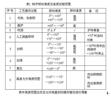 (7)轉(zhuǎn)爐冶煉工藝過程轉(zhuǎn)動角度及速度控制范圍要求見表1。