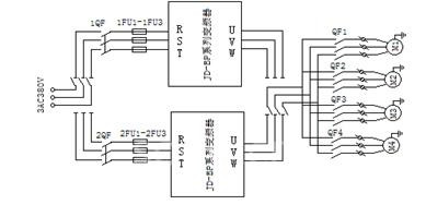 根據(jù)近幾年轉(zhuǎn)爐傾動控制系統(tǒng)的設(shè)計和應(yīng)用情況,設(shè)計單位針對“一拖四”控制方式(即一臺變頻器拖動四臺電動機)和“四拖四”主從控制方式進行了認真的比較,認為“一拖四”的控制方式,系統(tǒng)簡單,易編程調(diào)試和維護,從安全、合理的角度考慮,每座轉(zhuǎn)爐另外設(shè)一套變頻器裝置作為備用,以化解轉(zhuǎn)爐正常生產(chǎn)時,因變頻器故障而帶來的停產(chǎn)。最終設(shè)計單位確定了四臺電動機采用“一拖四”控制方式。轉(zhuǎn)爐傾動主回路如圖4所示。